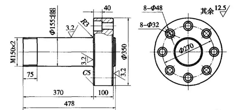 銘澤機械廠家建議液壓機設(shè)備客戶在主缸活塞桿斷開處鑲一段桿接手(圖2),桿接手一端制成與活塞桿同直徑的圓盤,并制均布螺栓沉孔,以便用數(shù)個高強內(nèi)六角螺栓與主缸活塞桿連接,端部有承接的凸臺與活塞桿桿頭修理處相對應(yīng),另一端仍制成與斷掉的桿段相同的與滑塊孔配合軸段和緊固雙螺母螺紋段。