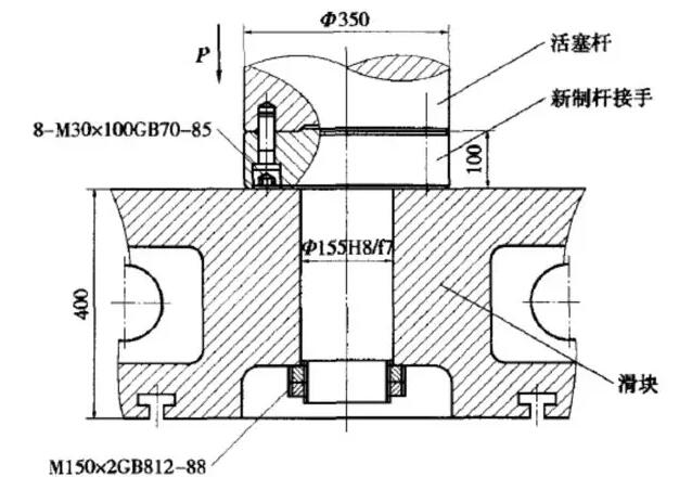 而其維修與修理過程詳細(xì)如下:拆除液壓機設(shè)備上的主缸活塞,將主缸活塞桿斷口處車平,并加工出與桿接手配合的止口,再加工均布的M30螺紋孔。按圖2制作桿接手。用M30高強內(nèi)六角螺栓將桿接手與活塞桿緊固在一體。將主缸和上橫梁垂直吊起,套入四個立柱之上,把上下立柱鎖緊螺母擰在立柱上,下鎖緊螺母應(yīng)充分緊固,上鎖緊螺母則應(yīng)稍留間隙備調(diào)整精度時用。充液桶安裝、加油,使主缸全行程動作數(shù)次,將油缸和管路內(nèi)空氣排除干凈。主缸活塞下行至與滑塊上平面相接觸后,用雙螺母固定(圖3)?;瑝K與主缸活塞緊固聯(lián)結(jié)后,按規(guī)定精度調(diào)整,將立柱鎖緊螺母盡量緊固。進行負(fù)荷試車。在滑塊側(cè)面醒目位置上設(shè)警示標(biāo)牌,標(biāo)“不得超過最大偏心距使用,嚴(yán)禁超過滑塊的最大行程使用”。當(dāng)修復(fù)后液壓機設(shè)備的開口高度由1200mm減小為1100mm,但仍可滿足工藝裝備要求。