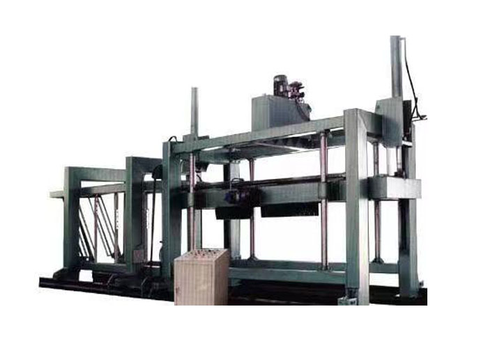 本廠生產(chǎn)的JFQ空中翻轉(zhuǎn)切割機(jī)是在德國伊通技術(shù)基礎(chǔ)上,結(jié)合國內(nèi)實際情況開發(fā)出的一種簡單、實用、高效的切割機(jī)組。翻轉(zhuǎn)吊具把模具空中翻轉(zhuǎn)90度后脫模把坯體連同模具側(cè)板放置在切割臺上,縱向切割裝置通過電機(jī)帶動自身行走,,對放置于切割臺上的坯體進(jìn)行行走切割,切割完成后行走至?xí)和N恢?,橫向切割裝置通過電機(jī)帶動自身行走到坯體中央,停止后再進(jìn)行水平式切割,橫切架自上而下垂直降落切割直至上升復(fù)位。
